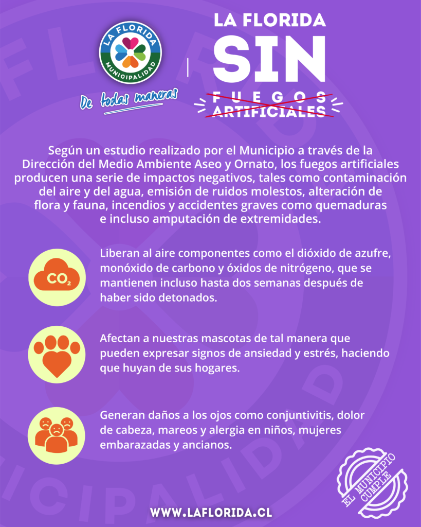 “La Florida, sin fuegos artificiales”, “el municipio, cumple”. Con estas frases, la Municipalidad de La Florida dio a conocer públicamente la medida que busca prohibir los fuegos artificiales en todo el territorio de la comuna.