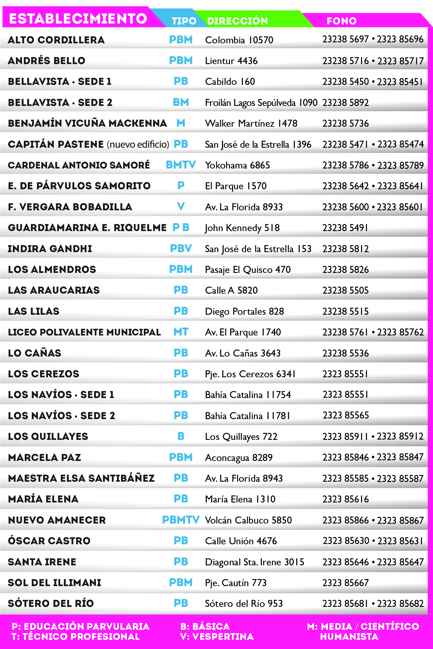 Se acerca el mes de marzo y, con él, un nuevo y desafiante año académico. Por esa razón y ante el inminente comienzo de otro periodo lectivo de clases, desde el Área de Educación de la Corporación Municipal de La Florida (Comudef), dieron a conocer un volante informativo con los números de teléfono de los recintos estudiantiles.