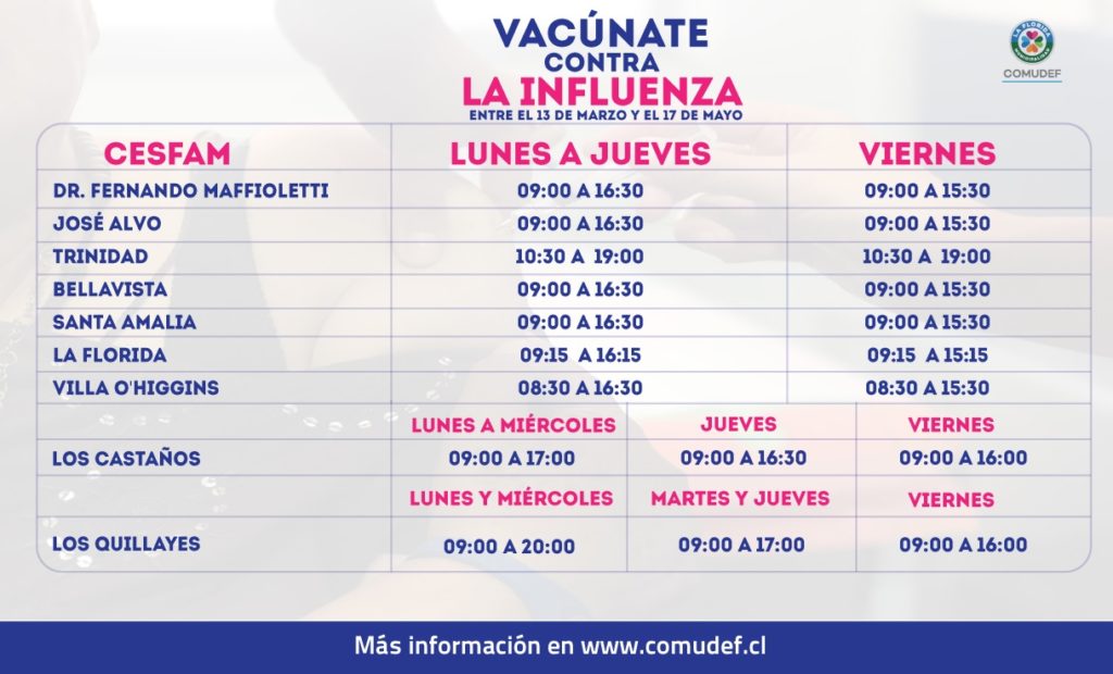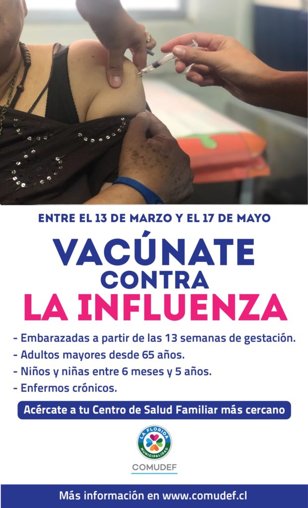 La campaña se está ejecutando desde el 13 de marzo y se extenderá hasta el 17 de mayo. Por esa razón, la red de nueve Centros de Salud Familiar de La Florida, se articularon, como ya es tradición cada año, para poder vacunar al denominado “grupo objetivo”, entre los que se encuentran niños de 6 meses a 5 años y adultos mayores de 65 y más; enfermos crónicos entre 6 y 64 años; personal de salud público y privado; trabajadores avícolas y criaderos de cerdos y embarazadas desde la 13ª semana de gestación.